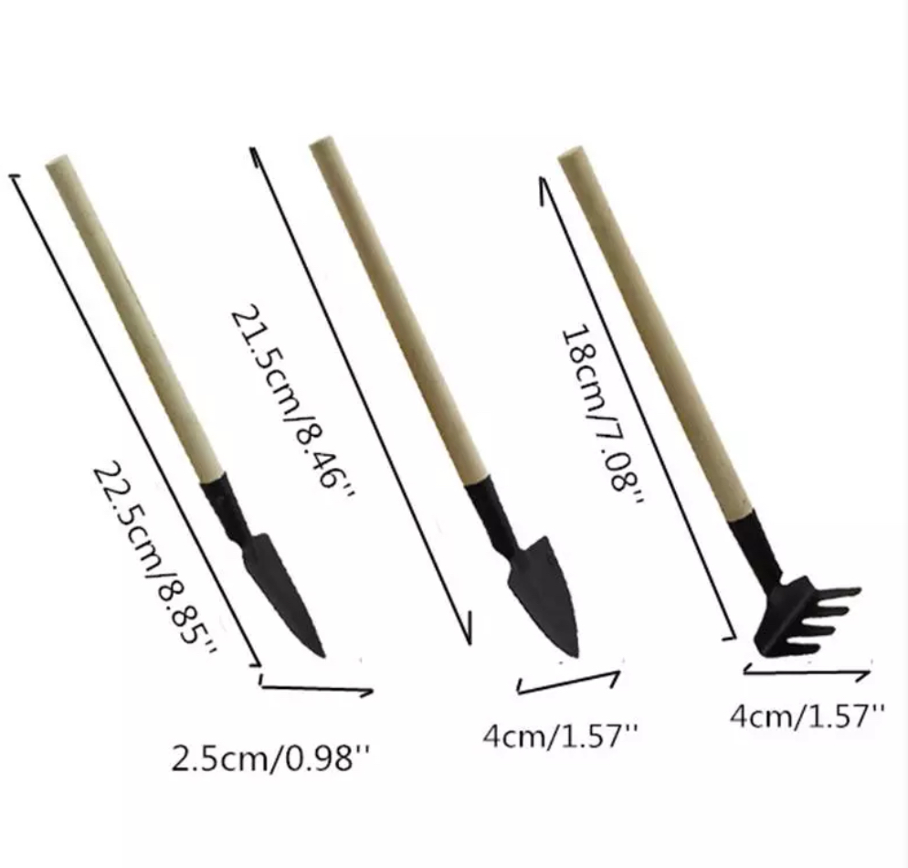Kit 3 unidades, Mini herramienta de mano de Jardinería, cabeza de metal, mango de madera. Ideal para jardineria a pequeña escala.