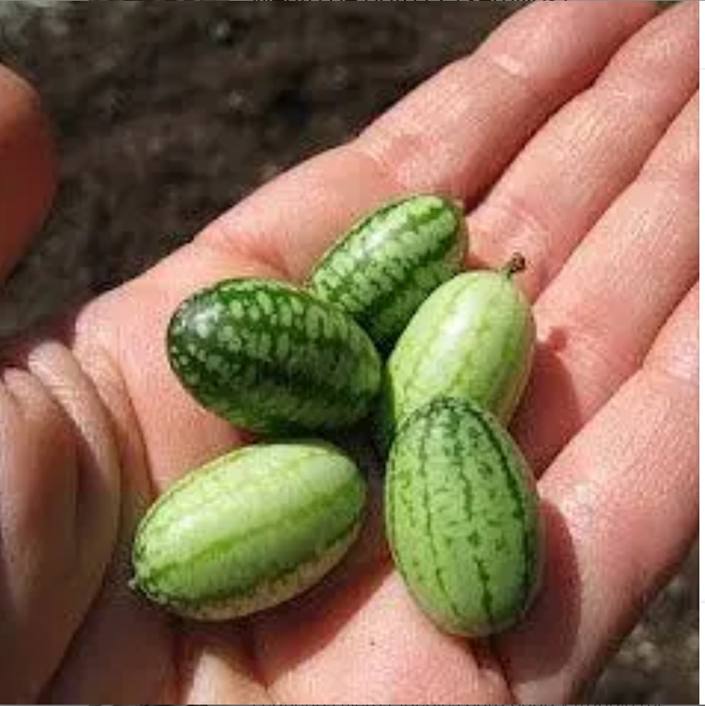 Sandia bonsái o Melothria scabra. Es una especie de planta trepadora cucurbitácea cultivada por sus frutos comestibles. Los frutos son del tamaño de uvas y de un sabor similar al pepino.